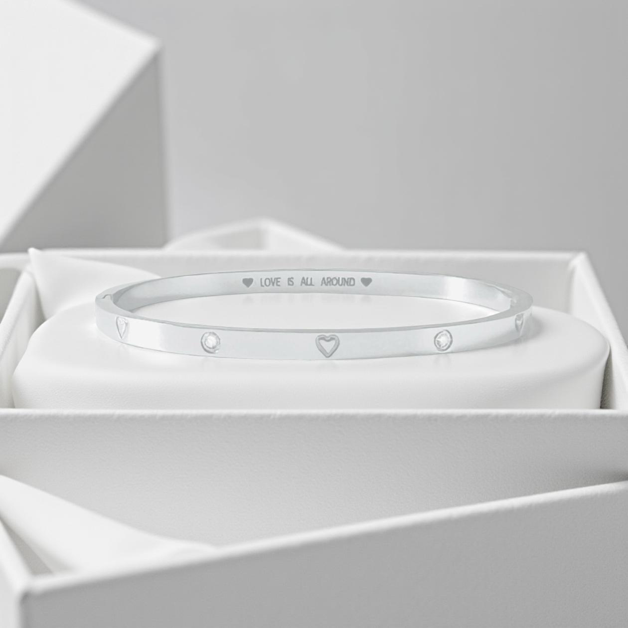 Silver Hinged Bangle with Hearts and Round Sparkling Gems with 'Love is All Around' message