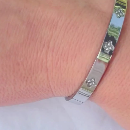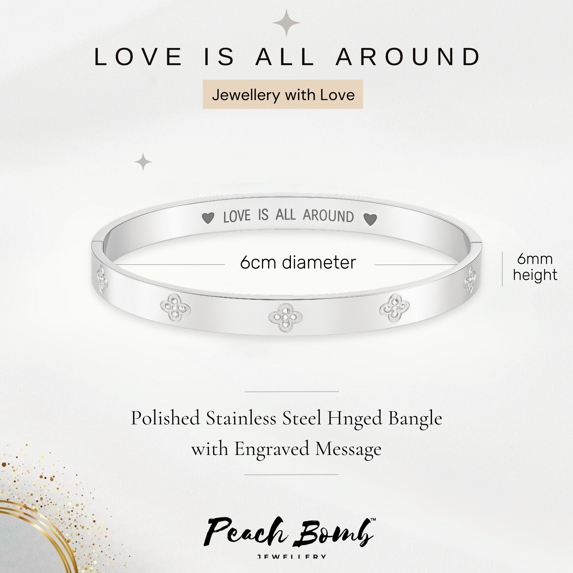 Silver Bangle with Clover Cubic Zirconia Details and 'Love is All Around' Engraved Message