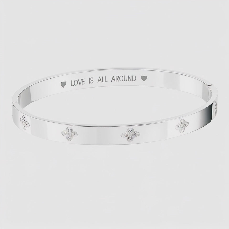 Silver Bangle with Clover Cubic Zirconia Details and "Love is All Around" Message