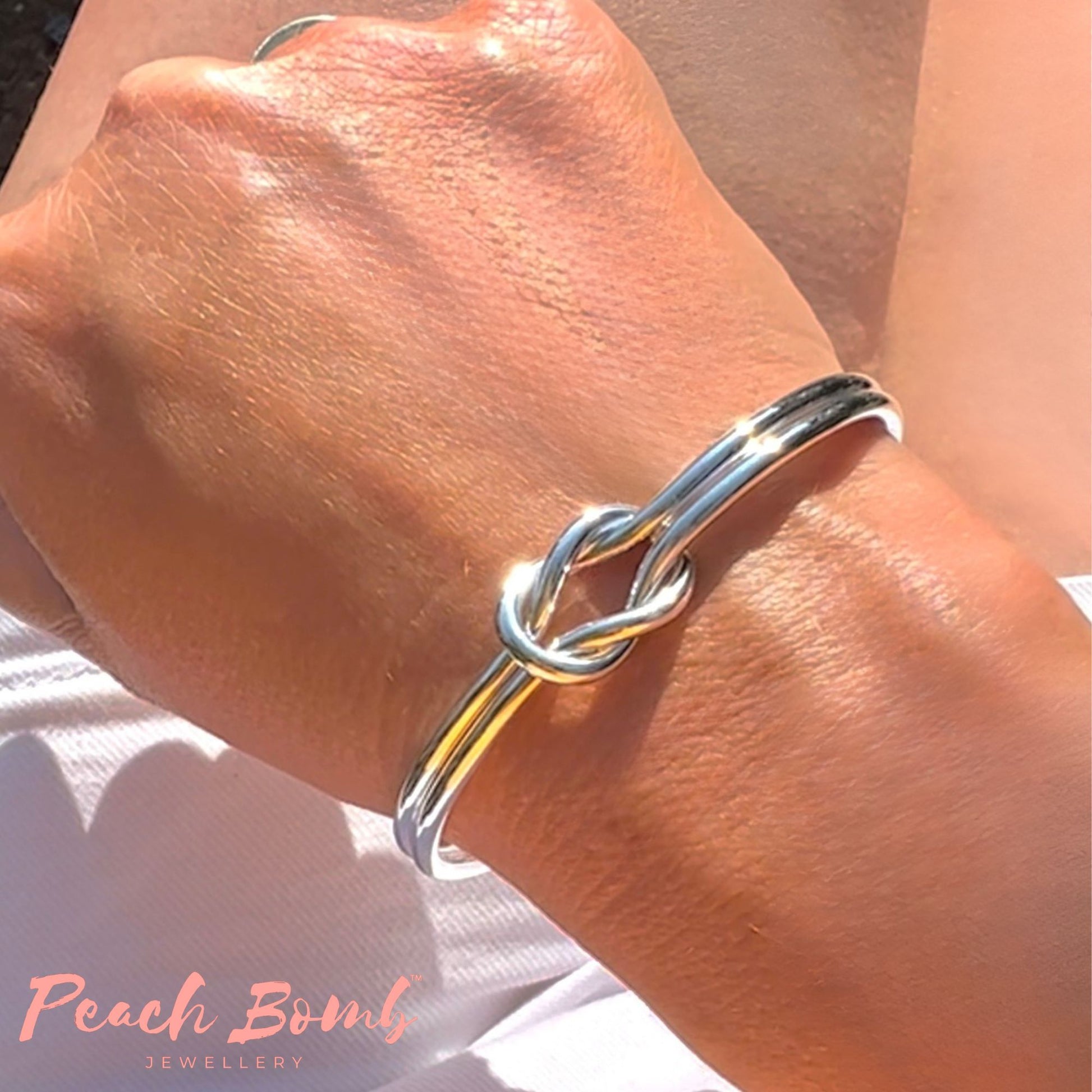 Celebrate love, friendship and connection with the Peach Bomb Love Knot Bangle — a timeless symbol of how our hearts intertwine. Hand-crafted with a smooth, polished silver-plated finish, this elegant open bangle features two entwined bands forming a classic knot design that never goes out of style.
